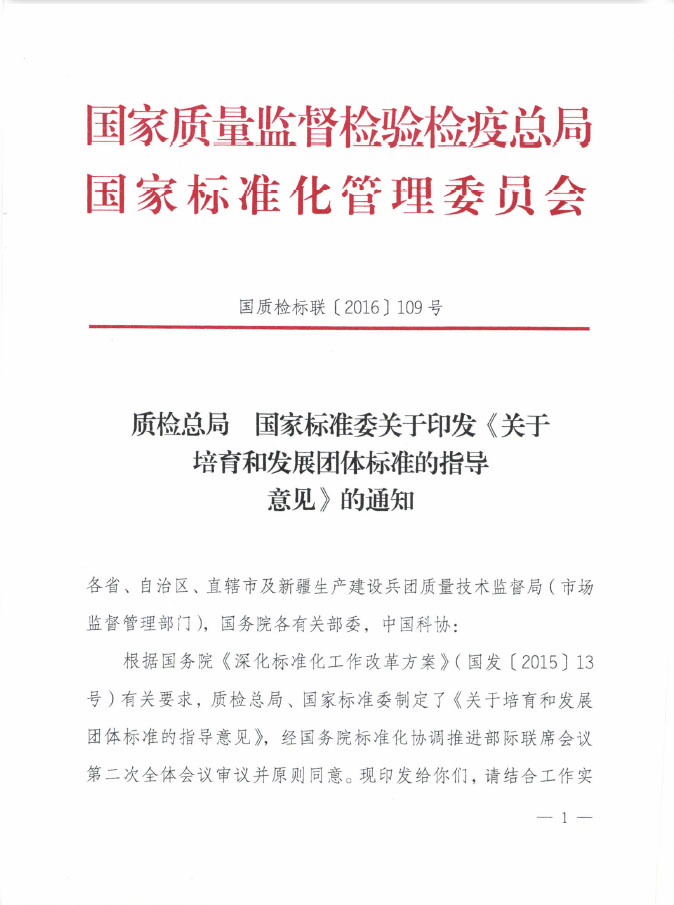 质检总局国家标准委关于印发《关于培育和发展团体标准的指导意见》的通知(国质检标联[2016]109号)